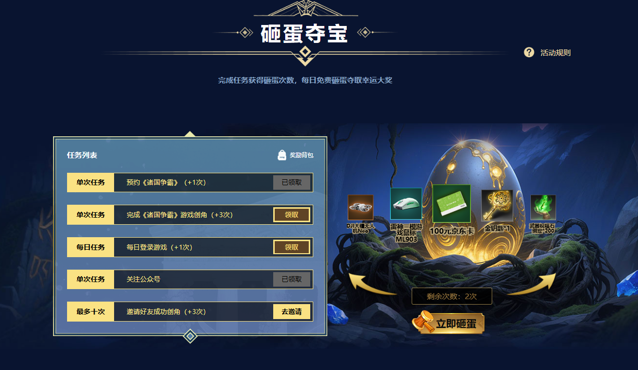 砸蛋夺宝有机会获得大疆无人机:完成每日任务获得免费砸蛋机会,即有概率拿走DJI大疆无人机、雷神鼠标、京东E卡等海量奖励!