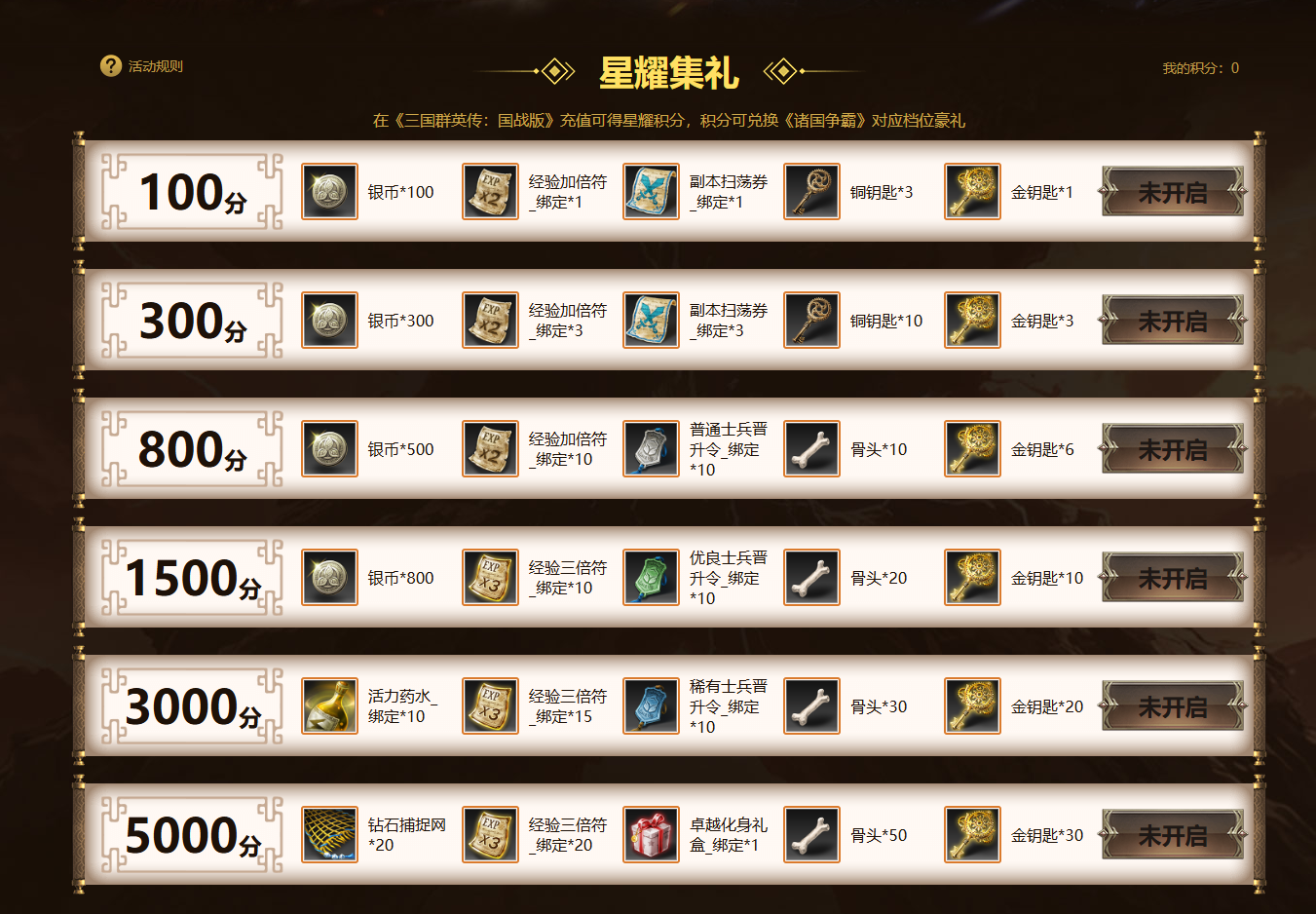 活动期间,在《三国群英传:国战版》充值的主君可获得星耀积分,所获积分可按档位在《诸国争霸》中兑换各类珍稀道具,收获更多好礼。(具体兑换查看活动细则)