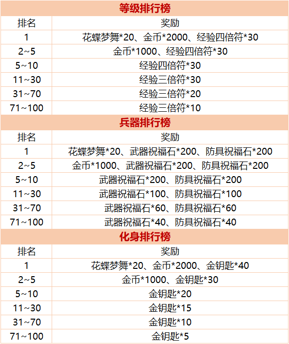 【活动内容】:活动期间,等级、兵器和化身排行榜上榜主君(前100名)可获得大量游戏道具,排行榜首位更可获得花蝶梦舞(使用可提升物攻15%、魔攻15%、对怪物增伤15%,作用时间12小时,死亡后解除使用状态)限定buff好礼。具体奖励如下: